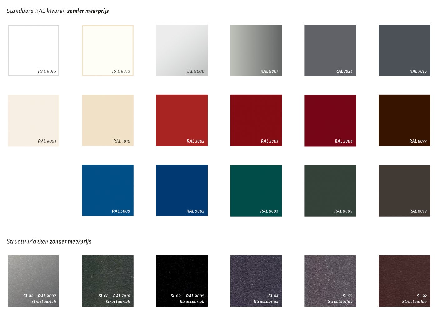 Breedte 1-delig max. 600 cm, dubbeluitvoering max. 1.200 cm, uitval max. 500 cm.